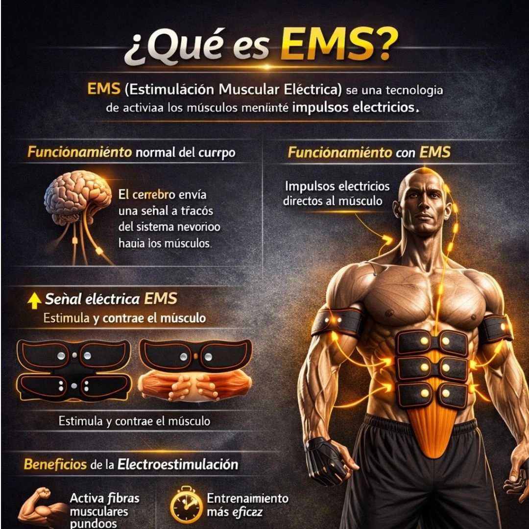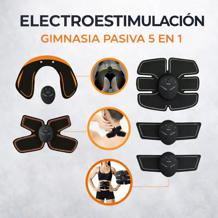 El Kit EMS 5 en 1 utiliza estimulación muscular eléctrica para generar hasta 400 micro-contracciones por minuto, activando abdomen, brazos, piernas, glúteos y cuello al mismo tiempo.
