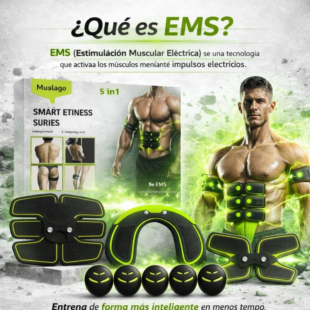 Si te cuesta ser constante o no ves cambios, este Kit EMS 5 en 1 activa abdomen, brazos y glúteos con micro-contracciones inteligentes que complementan tu entrenamiento sin esfuerzo extremo.